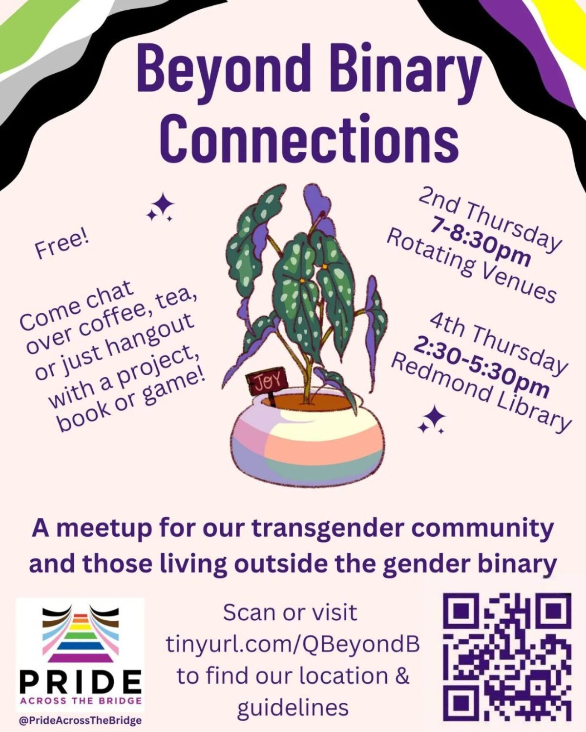 Pride Across the Bridge and the Redmond Library are co-creating a sapphic-centered book club for queer adults! Whether you’re into queer classics, messy drama, or soft sapphic stories—this space is for you. Join us for something joyful, cozy, and community-rooted. Meetings are on the 3rd Sunday of the month in 2026!