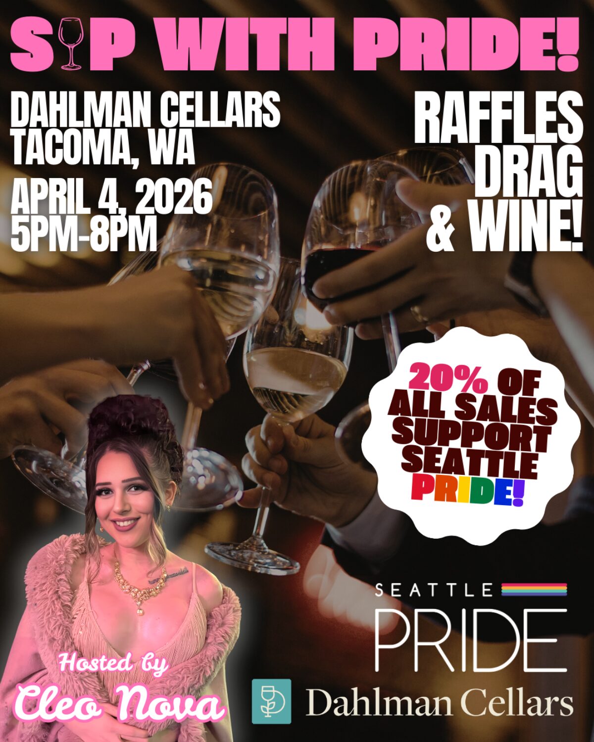 Join us at Dahlman Cellars in Tacoma for an evening of good wine, drag, and raffles! 20% of all sales during the event will benefit Seattle Pride and our year round programming.